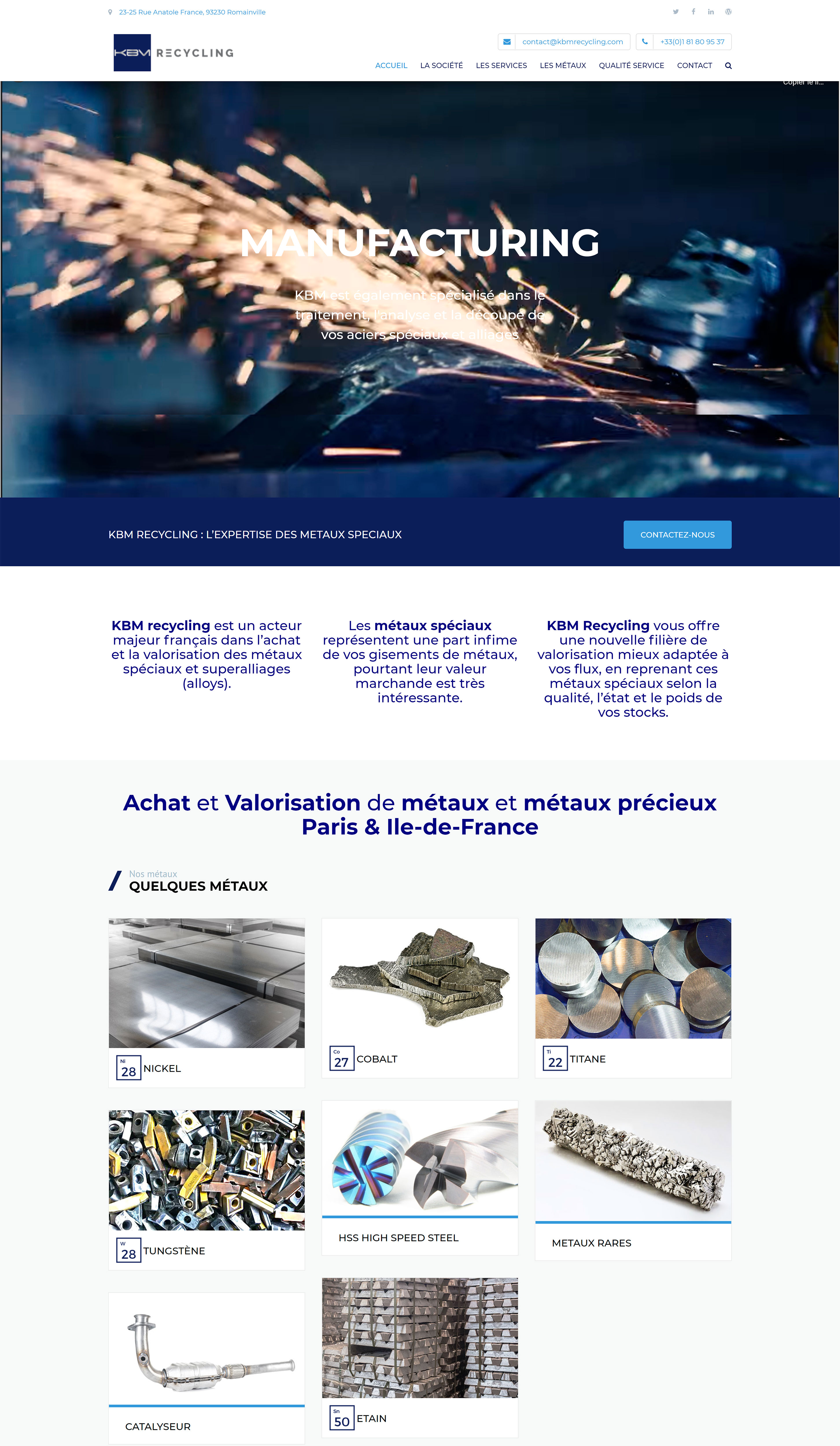 Contactée par l’entreprise européenne KBM Recycling ⛓🔗⚙🔩, celle-ci nous a fait la demande de la création d’un site internet (KBM Recycling L’expertise des métaux spéciaux • Collecte Tri Valorisation) ainsi que le design de plaquette commerciale et de cartes de visite.