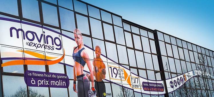Création d'un habillage publicitaire pour façade de bâtiment. Covering 45m² de vinyle . Moving Express Bonneuil