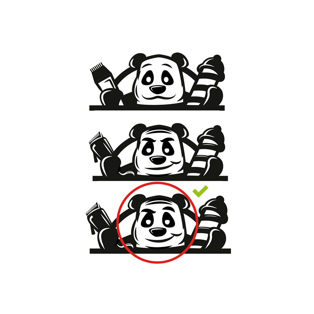 Enfin sur le visage même du panda, nous avons pas mal brainstromé pour finalement partir sur une expression du visage « narquoise » pour représenter à la fois deux expressions « douceur » et « force ».